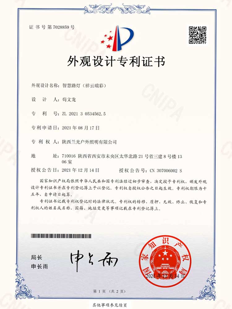 簡介—— 設計要點:設計元素融入了祥云,斗拱,意在吉祥、興盛。 專利種類:外觀設計 專利號:ZL 2021 3 0534562.5